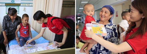 7月19日是手術(shù)第一天,將有36名患兒接受手術(shù)。公司為每位患兒準(zhǔn)備了水彩筆禮盒,員工志愿者們一早就來到病房探望患兒并協(xié)助進(jìn)行術(shù)前安撫。收到禮物的小天使們都非常開心,立馬打開禮盒拿出彩筆繪畫,微笑的太陽花、愛心形狀的城堡、七色的彩虹……繪畫給孩子們帶來了想象的翅膀和發(fā)自心底的開心,家長們也難得的在緊張的情緒中露出了微笑。