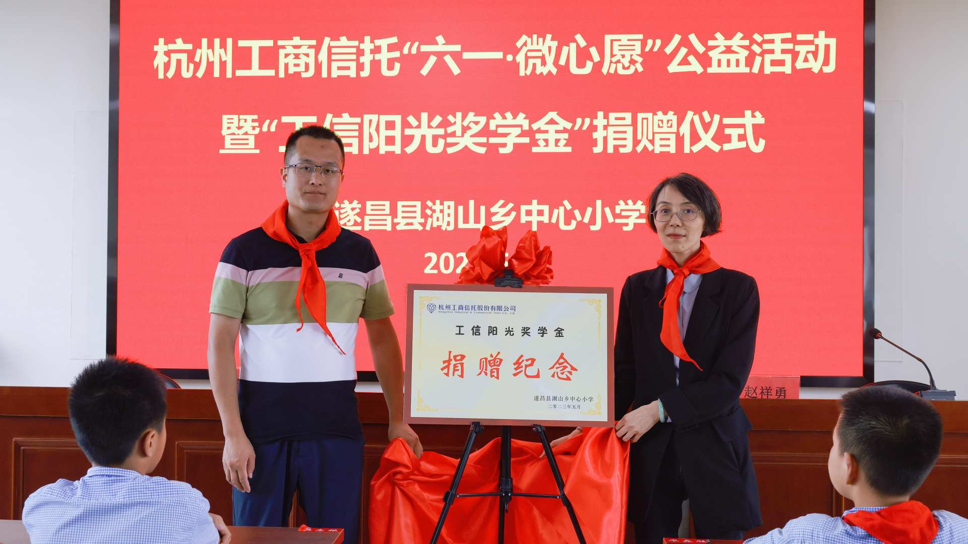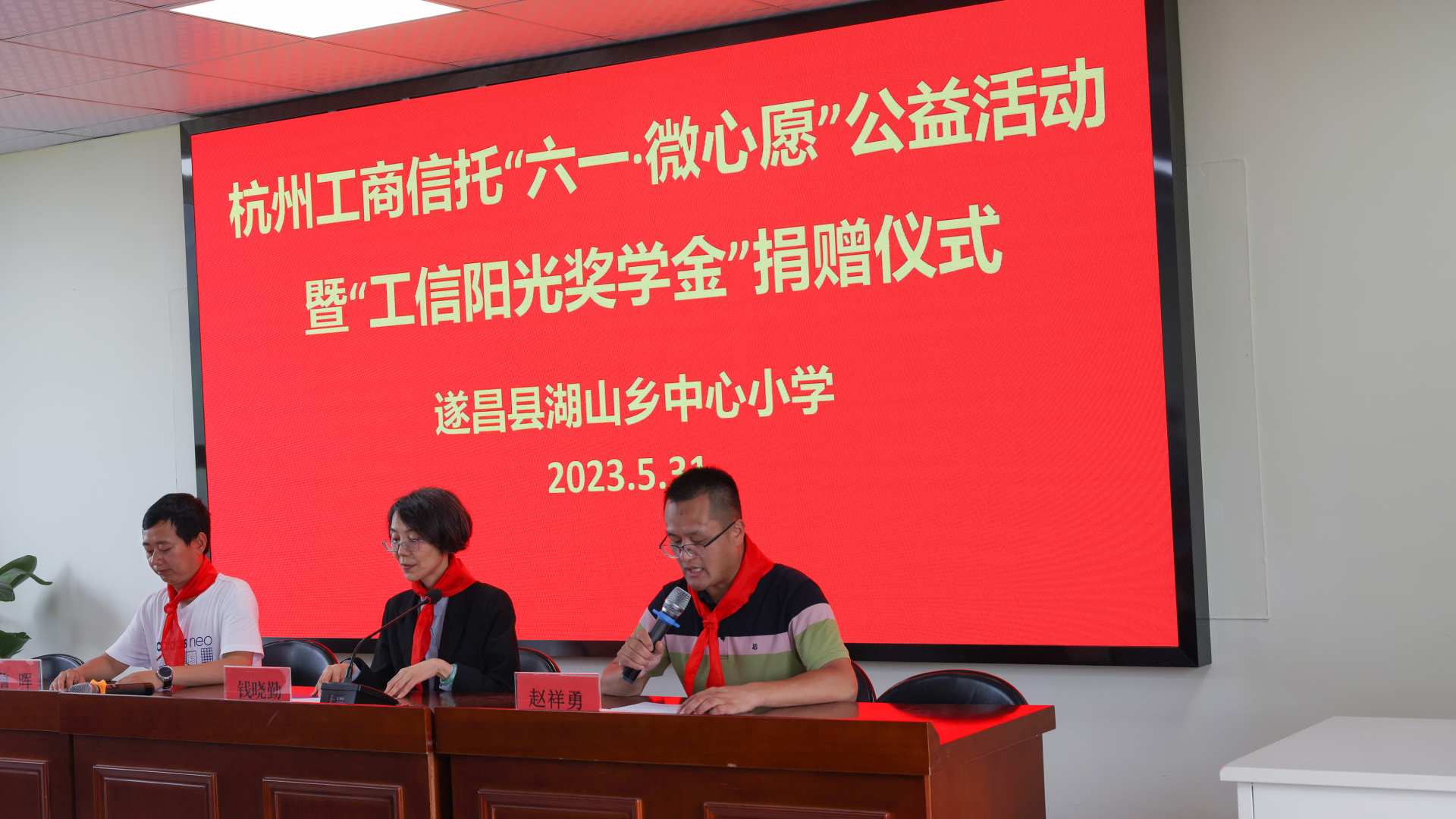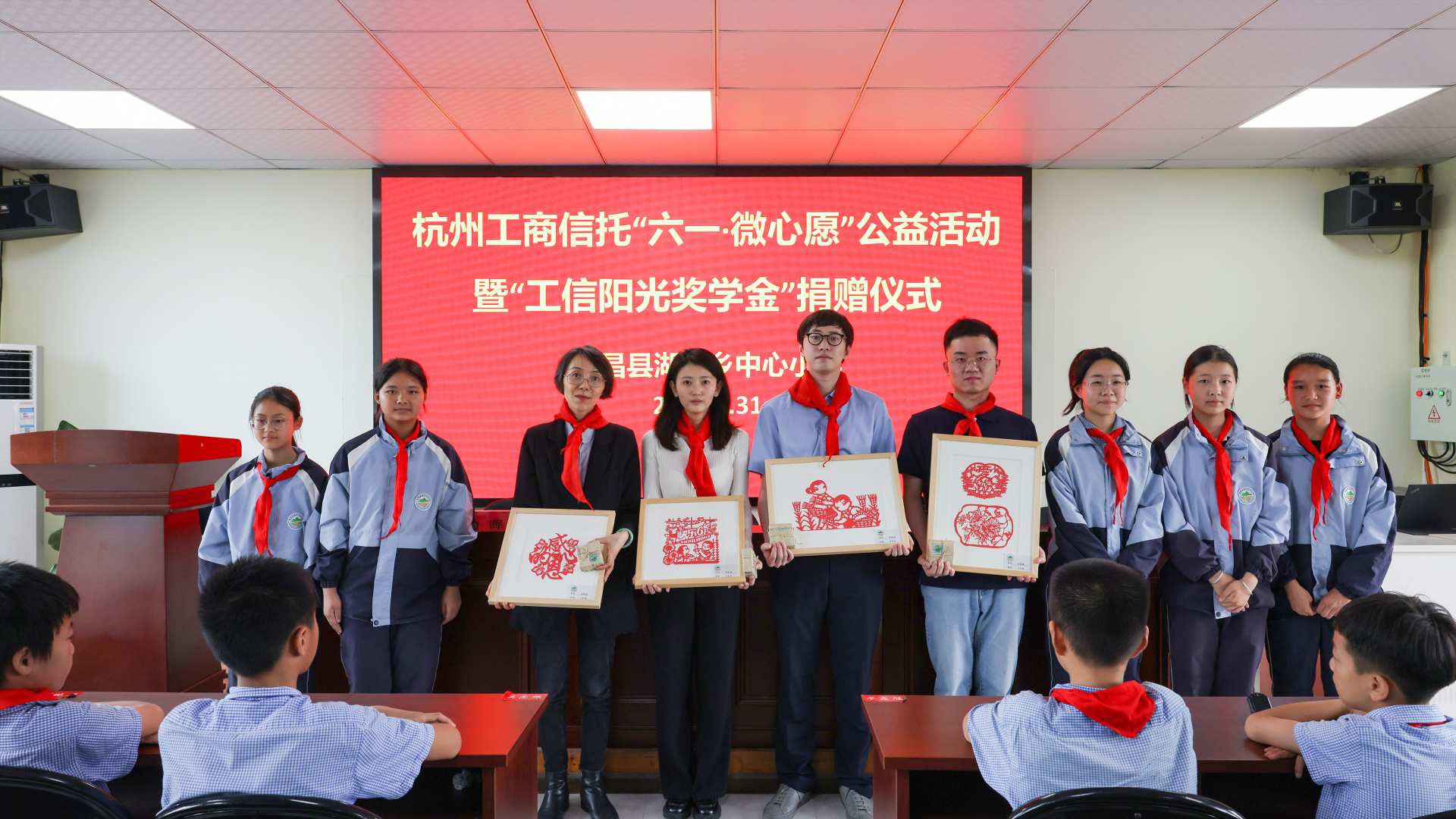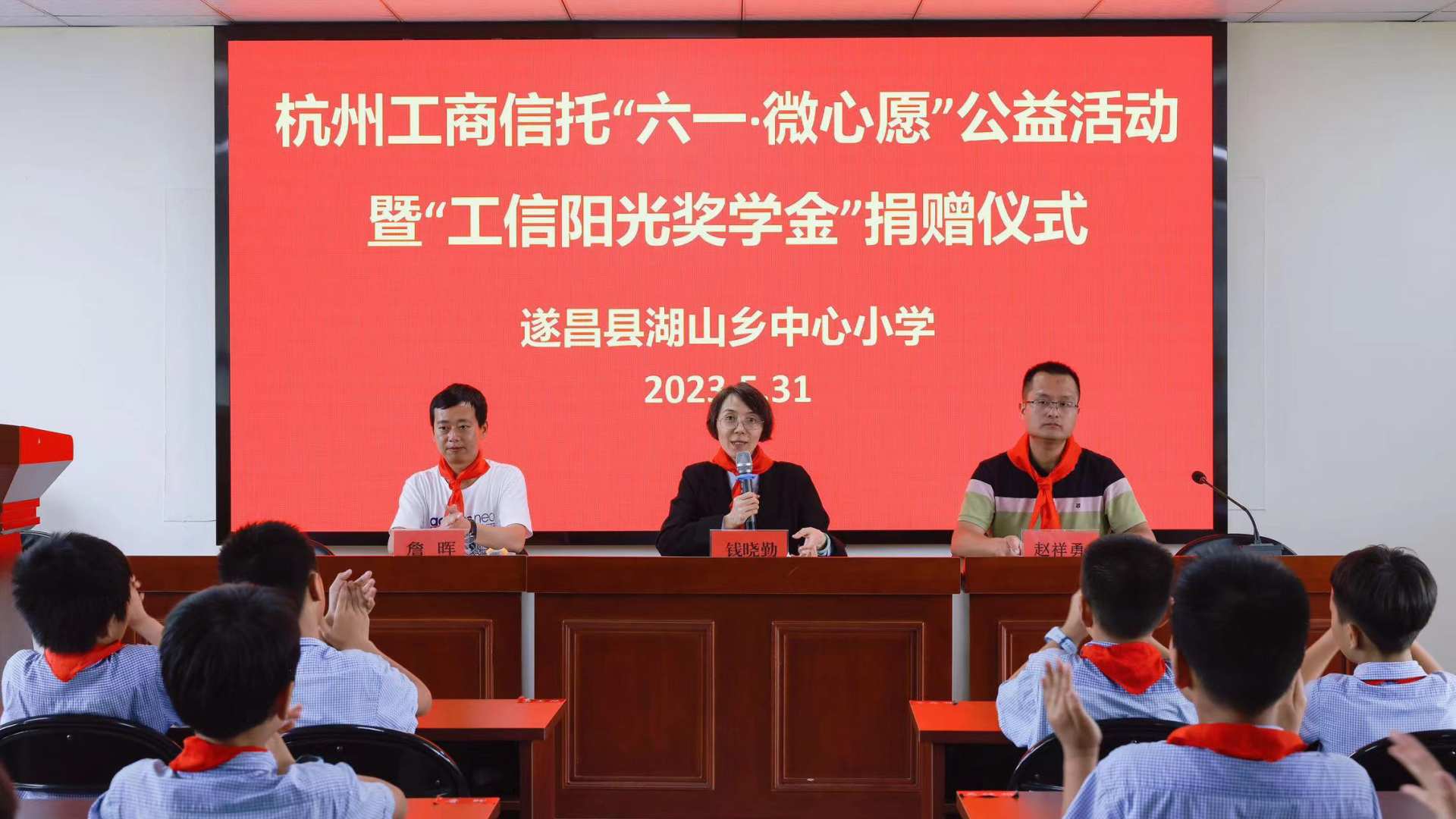 “今年是我們共同歡度的第八個(gè)兒童節(jié)了。除了給大家?guī)砹诵《Y物,在節(jié)日里滿足你們的一份小小心愿外,還帶來了電腦、打印機(jī)等設(shè)備 。同時(shí),‘工信陽(yáng)光獎(jiǎng)學(xué)金’今年依舊根據(jù)同學(xué)們的考試成績(jī)以及體育藝術(shù)方面比賽的成績(jī)等情況發(fā)放,希望同學(xué)們通過自己的努力,都能站上領(lǐng)獎(jiǎng)臺(tái)!”杭州工商信托黨委委員、總監(jiān)錢曉勤說到。
